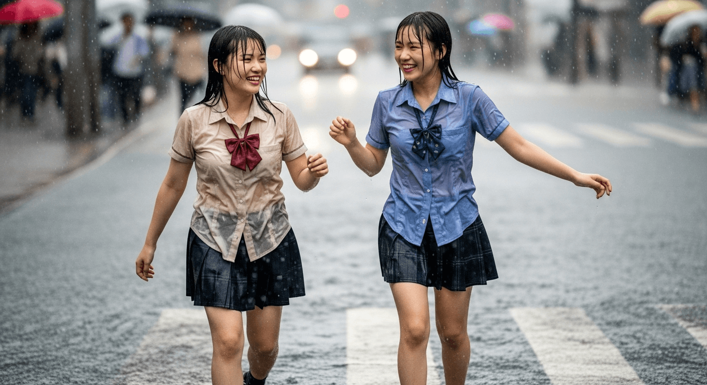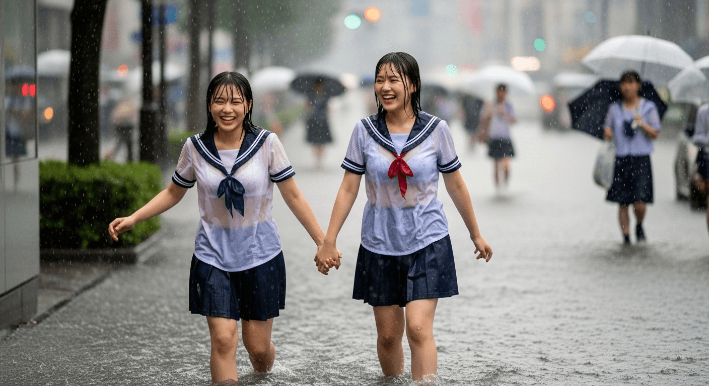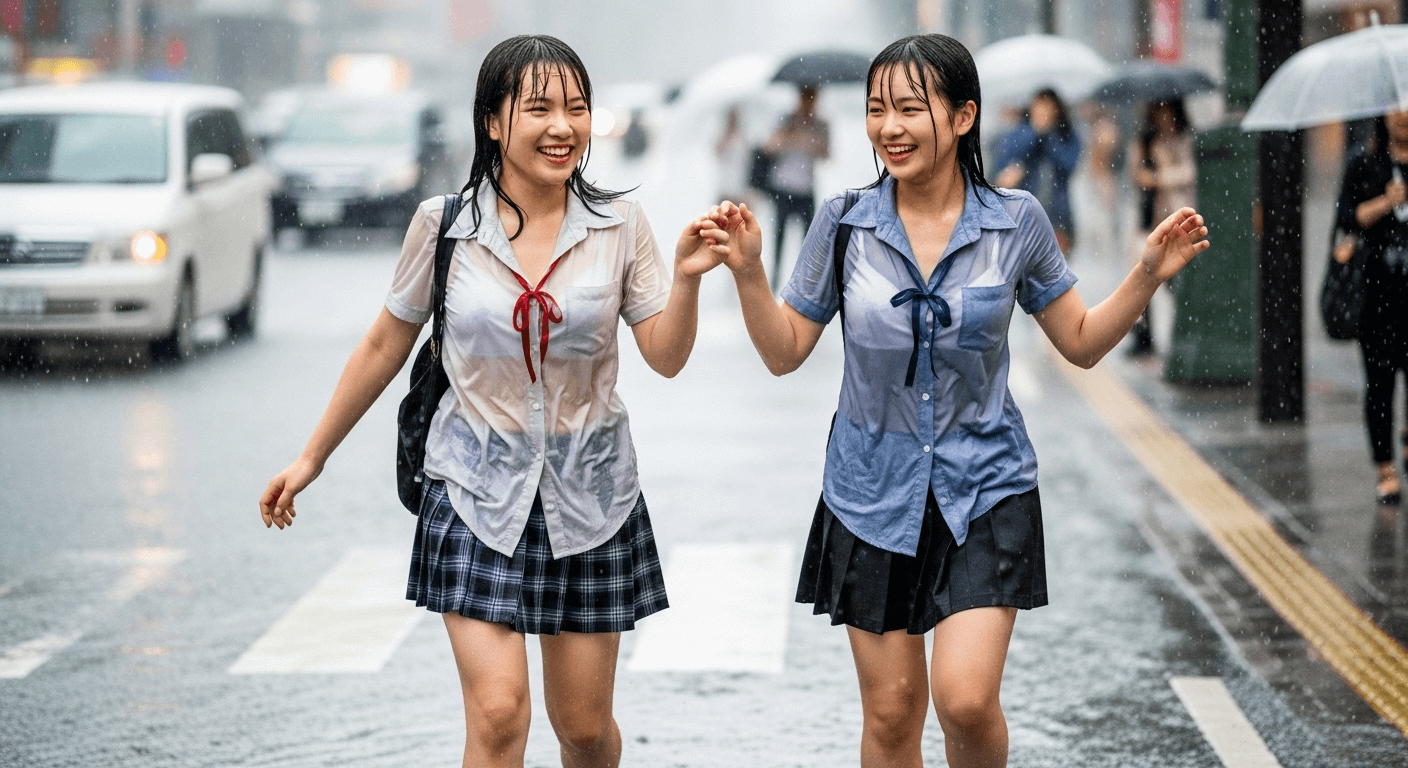 土砂降りでびしょ濡れになって透けてしまうJK JK制服セーラー服コス X Facebook はてブ Pocket LINE コピー 2025.07.23 ゲリラ豪雨が多いですね。 急に降られると傘の準備がなくて服がびしょ濡れになってしまう。 びしょ濡れになったら下着が透けてしまうのです。はずかちぃ。
