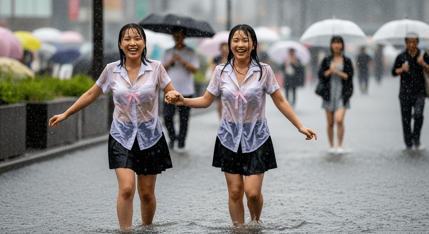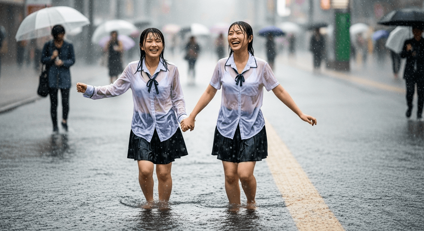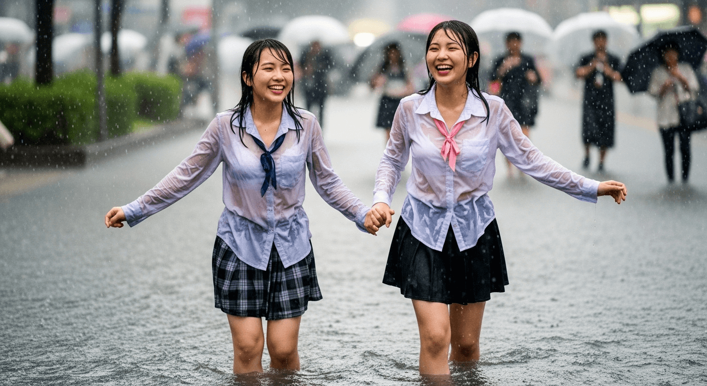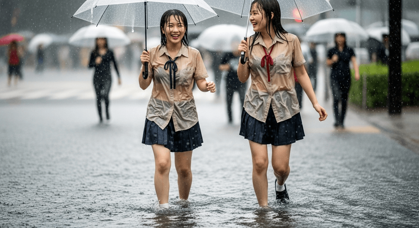 土砂降りでびしょ濡れになって透けてしまうJK JK制服セーラー服コス X Facebook はてブ Pocket LINE コピー 2025.07.23 ゲリラ豪雨が多いですね。 急に降られると傘の準備がなくて服がびしょ濡れになってしまう。 びしょ濡れになったら下着が透けてしまうのです。はずかちぃ。
